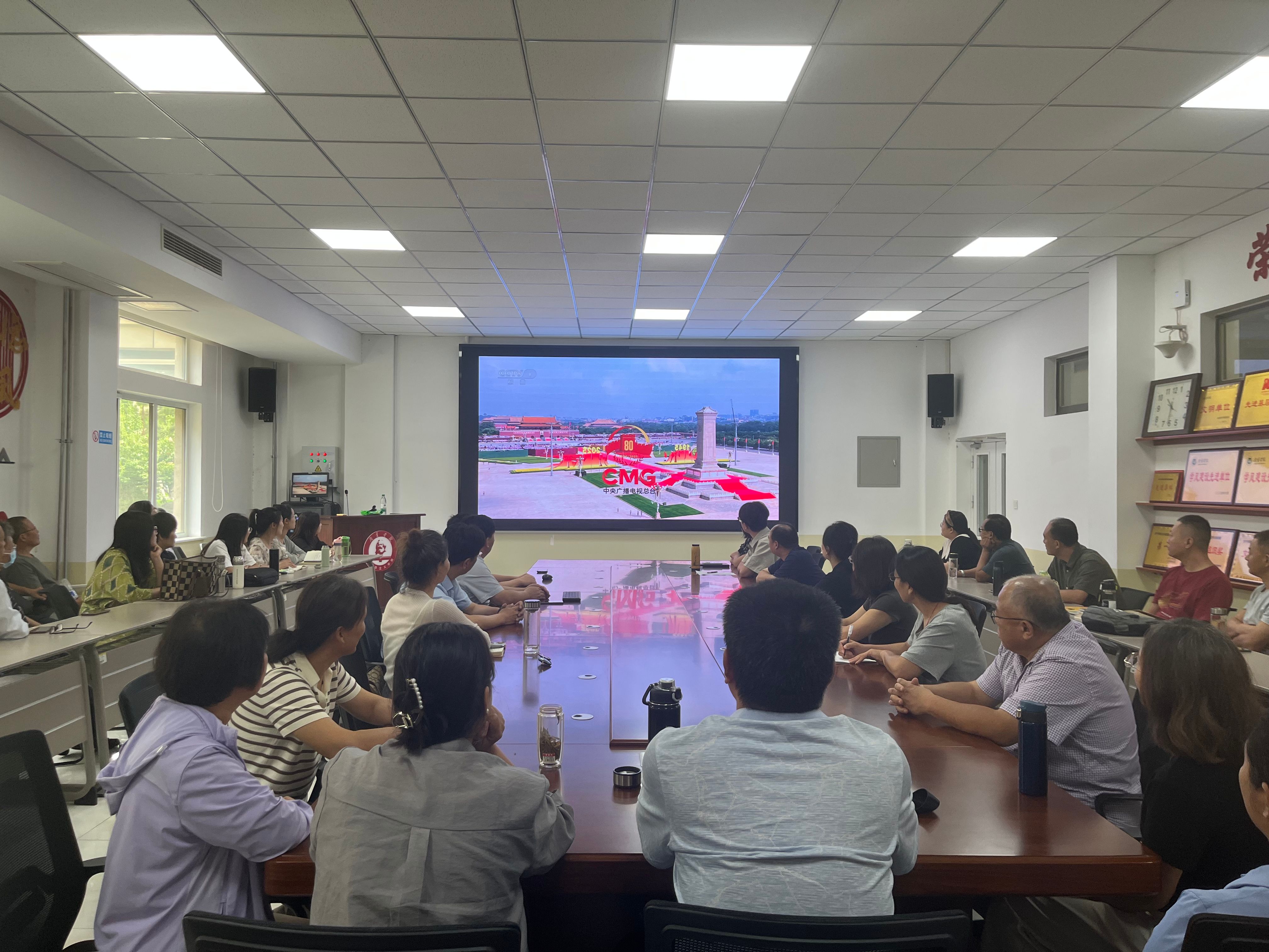 9月3日上午,纪念中国人民抗日战争暨世界反法西斯战争胜利80周年大会在北京天安门广场隆重举行,中共中央总书记、国家主席、中央军委主席习近平发表重要讲话并检阅部队。马克思主义学院第一时间组织全体教师观看大会直播,共同缅怀革命先烈,弘扬伟大抗战精神,汲取奋进力量。