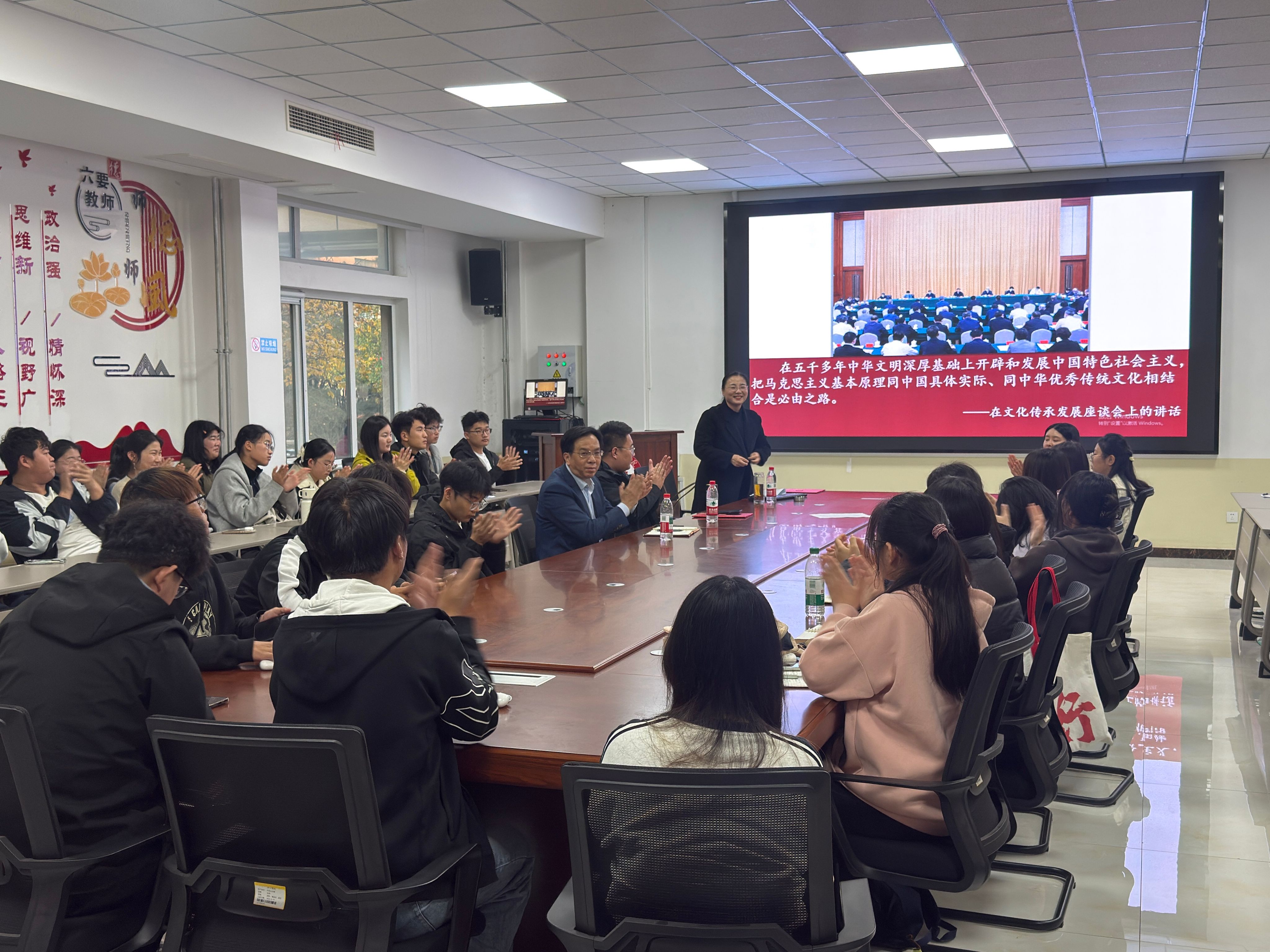 为深入贯彻落实习近平总书记关于文化传承发展的重要指示精神,推动中华优秀传统文化创造性转化、创新性发展,11月13日下午,马克思主义学院联合数学与大数据学院、人文与传播学院在马克思主义学院会议室举办“社会大讲堂”活动,马克思主义学院党委副书记胡国梁、数学与大数据学院副科级辅导员曹诚诚、来自三个学院的传统文化学生爱好者共同参与,活动由马克思主义学院团委书记付茹雪主持。