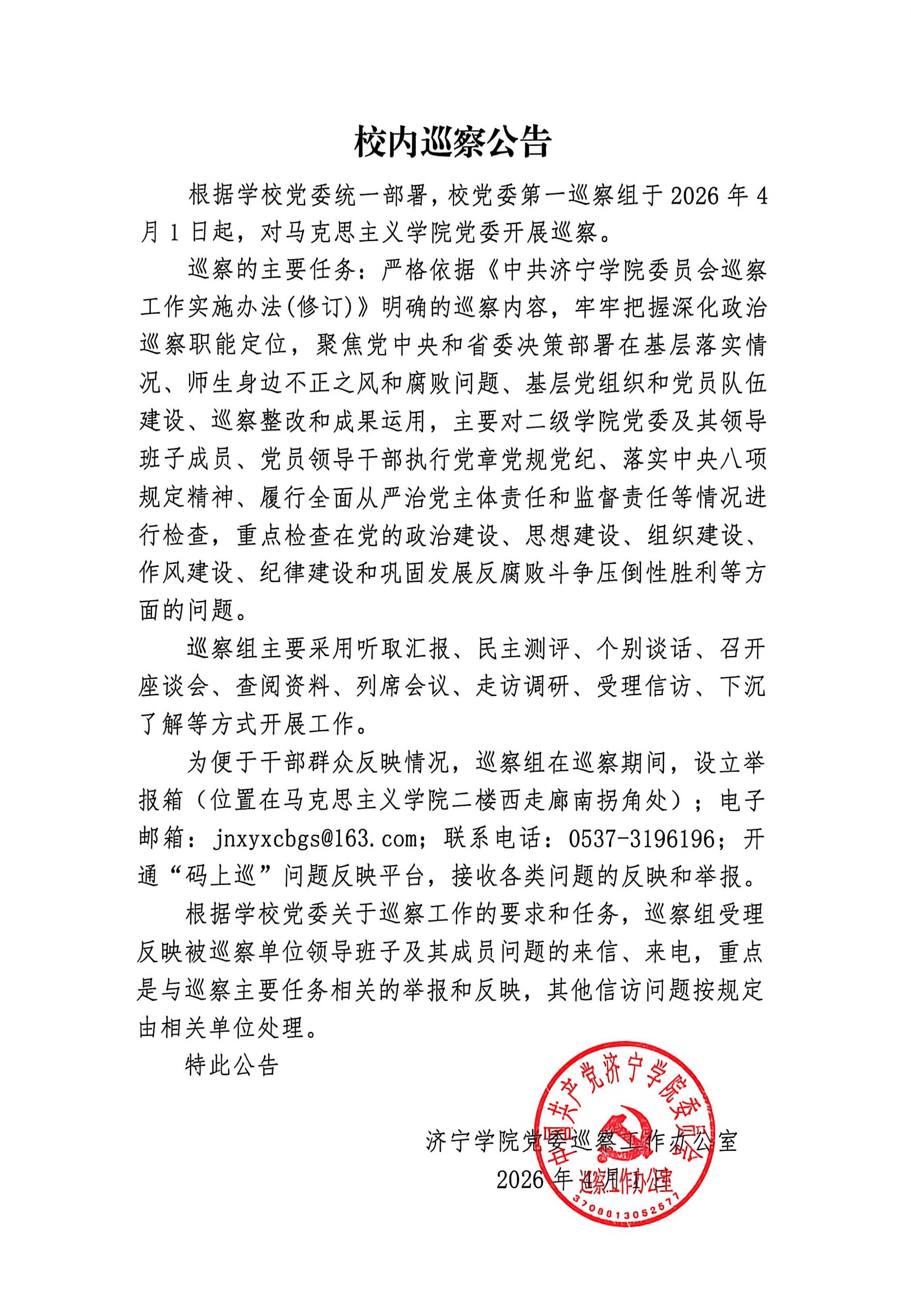 关于校党委第一巡察组对马克思主义学院党委开展巡察的公告